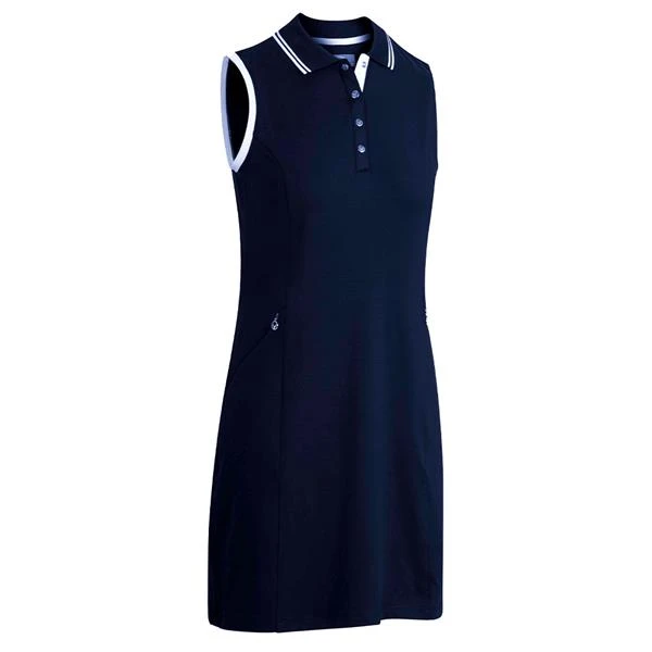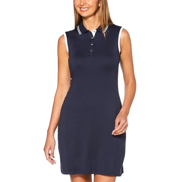 Elevate your performance golf wear with this sleek and simple golf dress. The sleeveless design is well suited to the warmer weather and frees your arms up to swing comfortably. The solid color is accented with eye-catching contrasting trim at the armholes and four-button placket. Four-way stretch inside shorts offer comfortable coverage that moves with you, and can be easily detached with a snap as needed. Zippered pockets offer convenient hands-free storage for your scorecard and other small essentials.