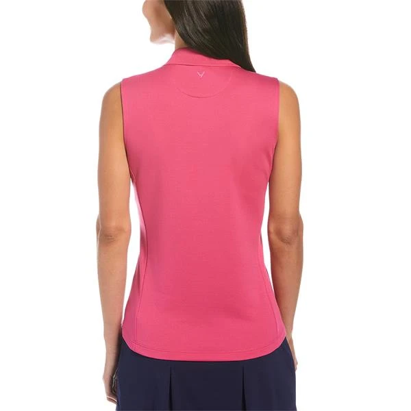 Stay cool and comfortable out on the course in this versatile solid-colored Callaway women’s golf shirt. The sleeveless ladies’ golf top has moisture wicking and cooling technology to help keep you feeling fresh. It’s crafted from a textured fabric for added visual interest, and the material features a hint of stretch for enhanced range of motion and a flexible fit.